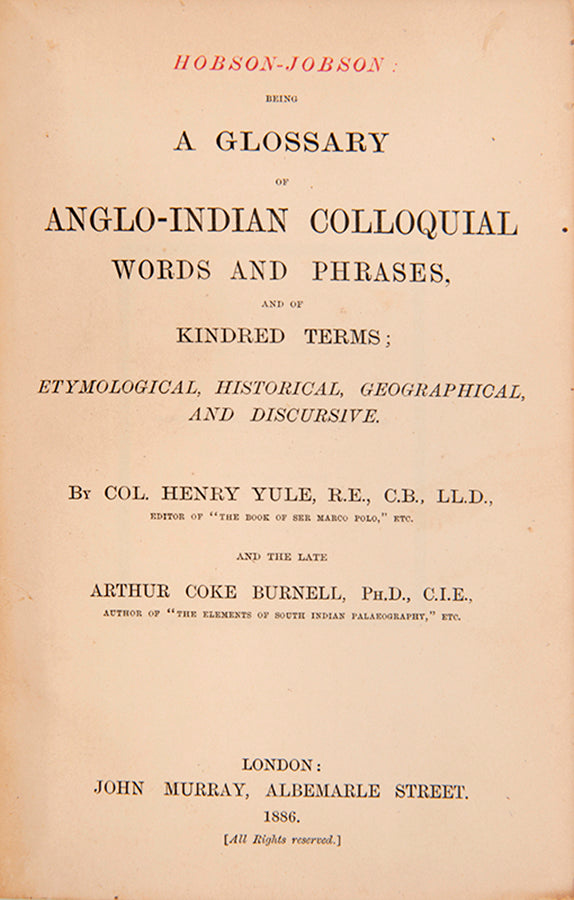"Yule's reputation rests... on his authorship (with A. C. Burnell) of an extraordinary glossary of Anglo-Indian colloquial words and phrases, published under the felicitous title Hobson-Jobson, in 1886. This encyclopaedic work, which has been reprinted several times since, provides modern historians with a unique view of the everyday language of British officers in colonial India. Yule was fascinated by the complex history of the incorporation of Hindustani, Bengali, and other Indian terms into English usage, and his rendering of this history in the form of an idiosyncratic yet highly engaging glossary has proved, perhaps ironically, to be his most enduring literary contribution" (ODNB).