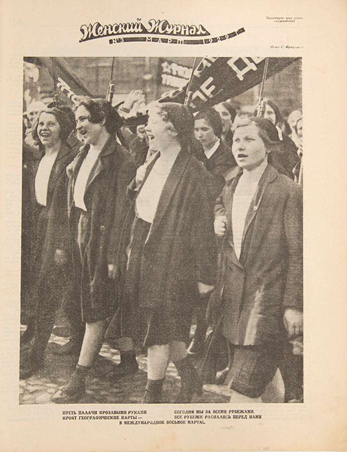 Runs of Zhenskiy zhurnal are notably scarce with only a handful of issues in institutions worldwide. The Constructivist covers were mainly designed with photomontages by Semen Semenov-Menes (1895-1982), one of the leading Soviet masters of movie poster design. Together with Stenberg brothers, he created the well-known style of advertising posters for Mezhrabpom films. The journal was issued monthly between 1926 and 1930 and included short stories, poetry, international current affairs (including scathing attacks on class enemies) as well as advice on how to run a home, family health, needlework and recipes. Each issue also includes a section on fashion with vivid illustrations reflecting the latest 1920s style, some of which is 'Slavicised' with floral embroidery.