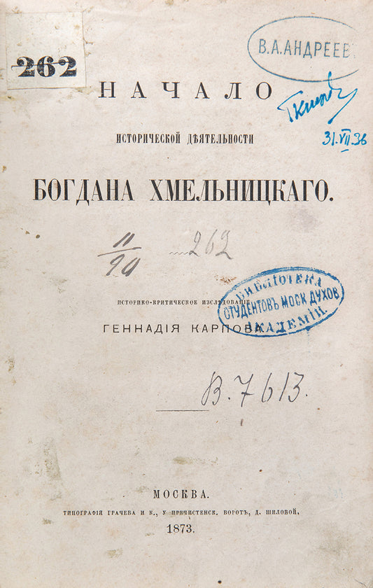 Nachalo Istorichesko deiatel'nosti Bogdana Khmel'nitskiy [The Beginning of the Historical Activity of Bohdan Khmel'nitskiy].